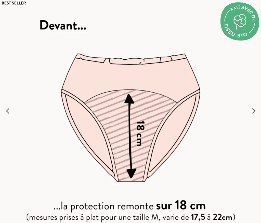 NB : si ton flux est hémorragique (stérilet au cuivre, endométriose, dérèglement hormonal…) il se peut que le jour le plus abondant tu doives changer de culotte pendant la journée. Tu peux également utiliser ta culotte avec une protection interne, en début de journée et finir avec la culotte seule, pour le reste de la journée.