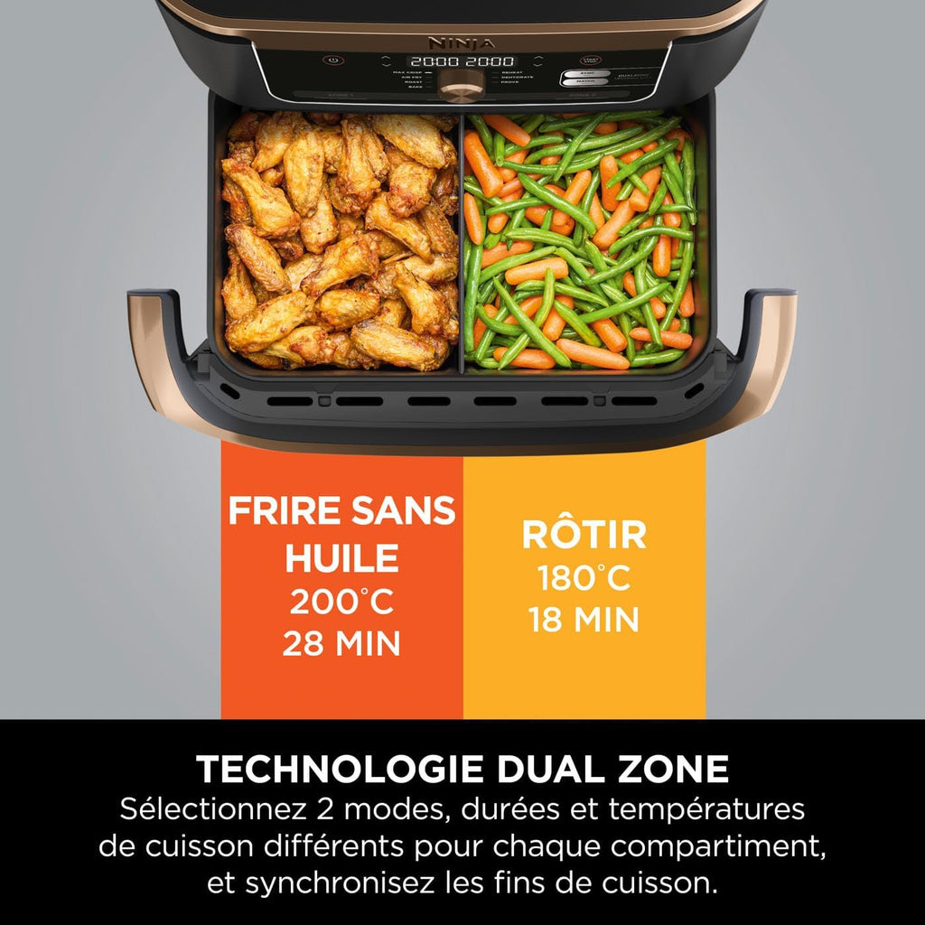 - TECHNOLOGIE DOUBLE ZONE : Cuisinez 2 aliments de 2 manières différentes, tous les deux prets en même temps! Peut contenir un poulet de 2kg ou 1,5 kg de frites dans chaque zone de 5,2L