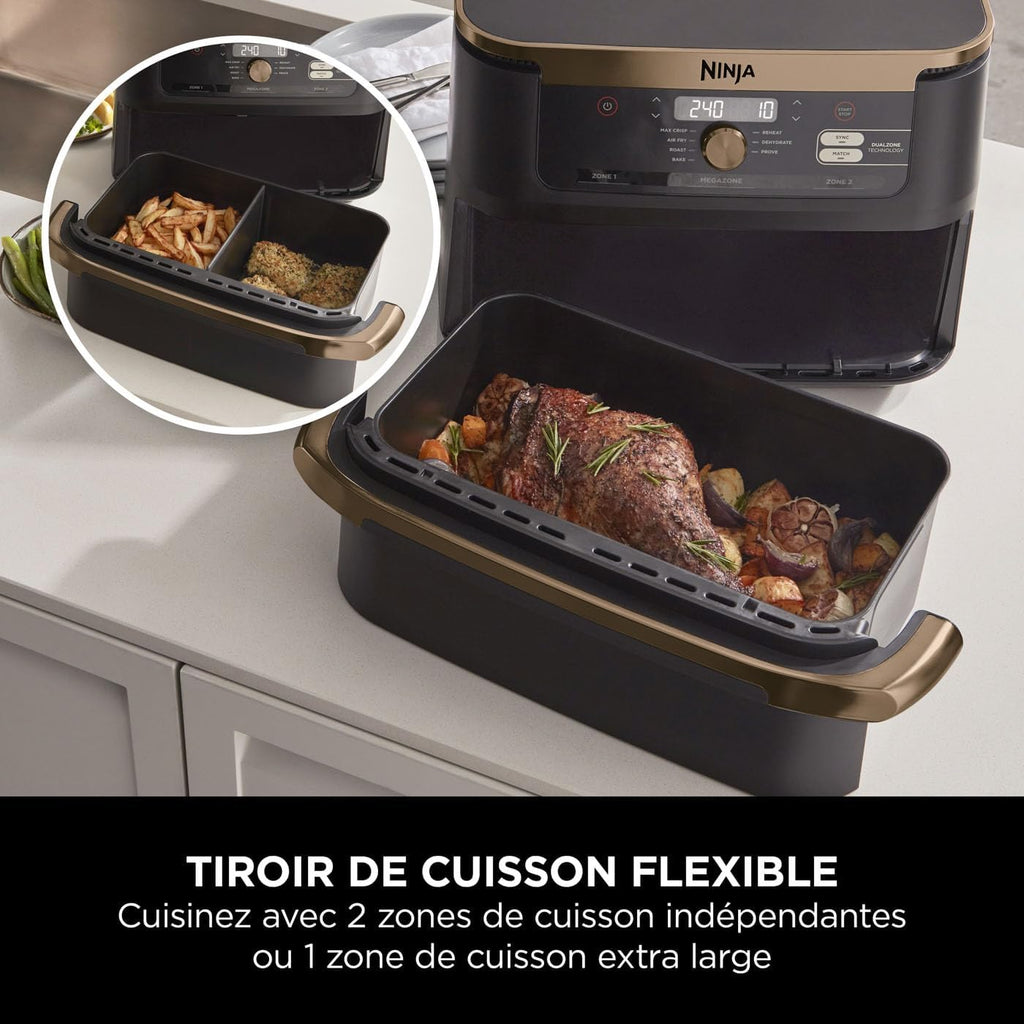 - INCLUS: Ninja Foodi Flexdrawer Air Fryer (prise EU), Tiroir Antiadhésif de 10.4L, Compatible avec le Lave-Vaisselle, Séparateur et 2x Plaque Croustillantes, Guide de Recettes créé par des Chefs. Couleur: Noir & Cuivre