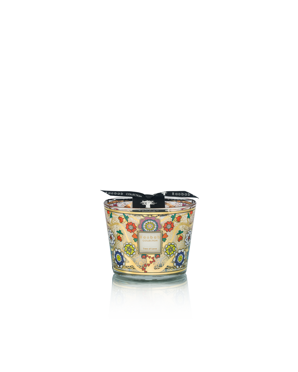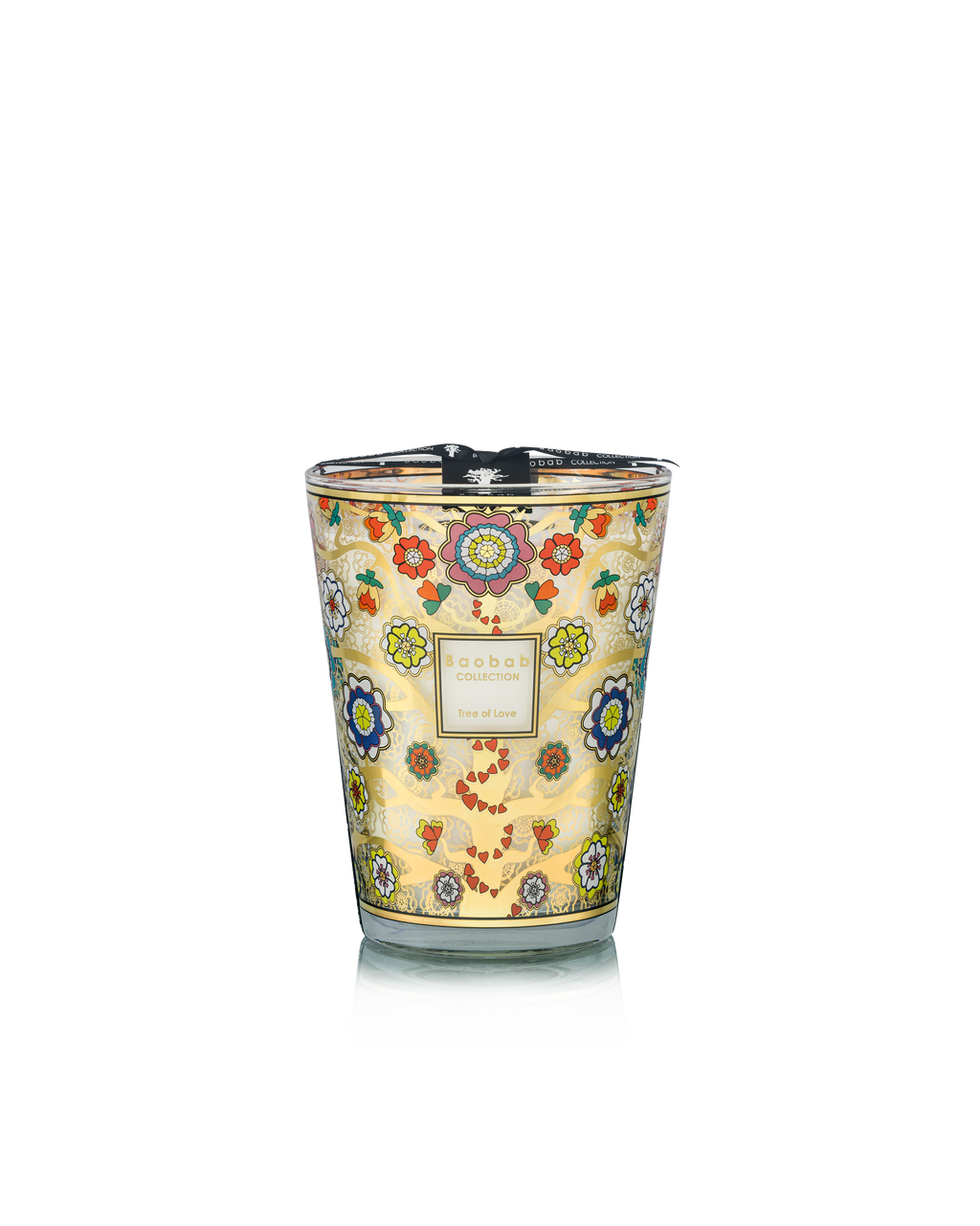 La bougie parfumée Tree of Love se distingue par sa sérigraphie élégante en or et aux couleurs multiples, inspirée de l’iconographie des arbres de vie. Ses branches dorées sont ornées d’une profusion de fleurs dont les pétales en forme de cœur s’entrelacent à l’infini.